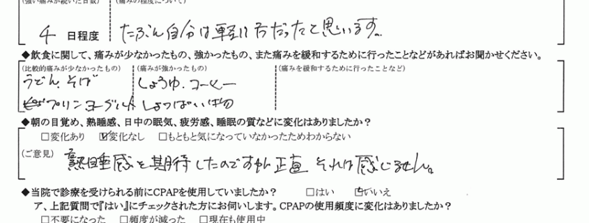 いびきの軽減が出来ただけでも充分に効果が有ったと思います。