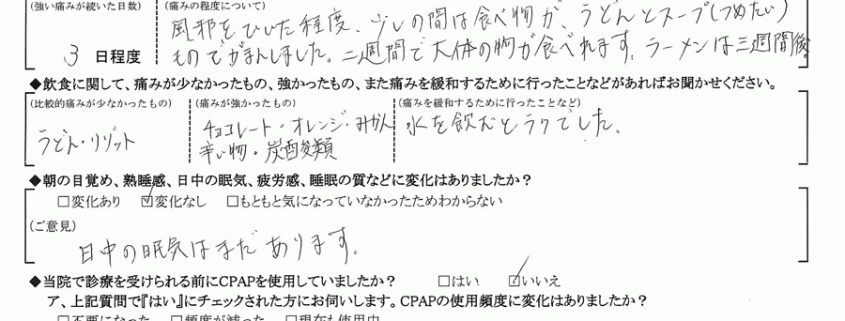 (痛みの程度について) 風邪をひいた程度、少しの間は食べ物がうどんとスープ(つめたい)ものでがまんしました。