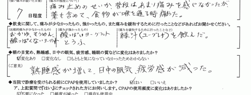 (痛みの程度について) 痛み止めのせいか、普段はあまり痛みを感じなかったが、薬も含めて食物が喉を通る時痛かった。
