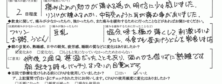 (ご意見) 術後2週間禁酒だったこともあり、酒の力を借りずに熟睡です。