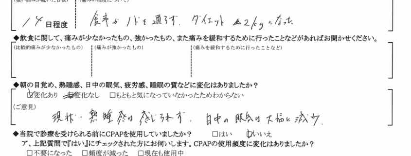 (ご意見) 現状、熟睡感は感じられず。日中の眠気は大幅に減少。