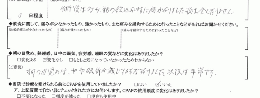 (痛みの程度について) 術後は多少、物の飲込む時に痛くなりました。後は全く有りません。