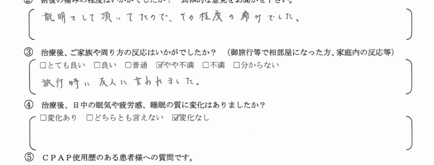 ウ、いびきの音以外で、術後気になる点はございますか?