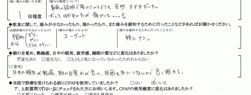 (痛みの程度について) 事前の説明で聞いているよりも全然大丈夫だった。むしろ、ope中の方が痛かった。