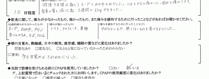 (ご意見) 術前は夫に何度も横向きになるようおこされていたのがなくなり、よく寝られるようになりました。