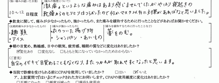(痛みの程度について) 『激痛』というような痛みはあまり感じませんでしたが、やはり寝起きの乾燥からのヒリヒリはつらかったので何かマスク以外に対策があればなと思いました。