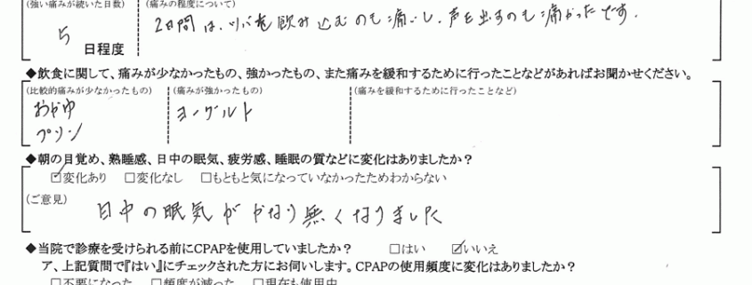 しかし、周囲からいびきをほとんどかかなくなったと聞き、手術をやって良かったと思います。