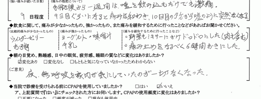 いびき・無呼吸については完全に腫れがひき、痛みの意識が無くなったのは1ヶ月後です。