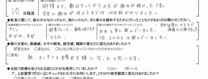 小学生の頃よりいびきがありましたが、今回思い切って手術をしていただき、本当に良かったと思います。激痛でしたが、今までの悩みが減り心が軽くなりました。