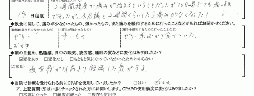 (痛みの程度について) 2週間程度で痛みが治まるということだったが、10日過ぎても痛いままであったが、不思議と2週間くらいしたら痛みがなくなった!