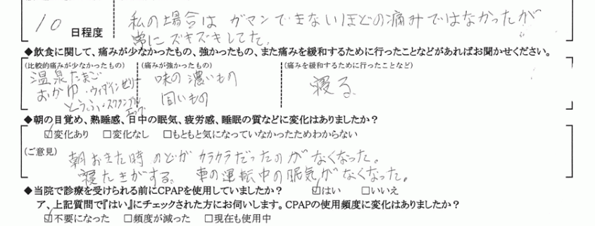 (ご意見) 朝起きた時のどがカラカラだったのがなくなった。寝たきがする。車の運転中の眠気がなくなった。