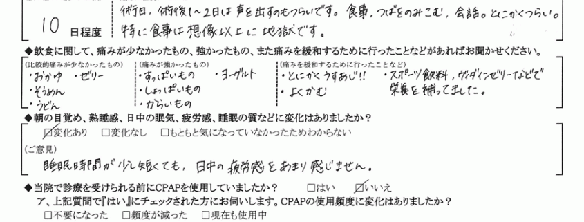 初診から術後の再診まで、皆様本当に親切にしてくださいました。手術に対する不安感をやわらげてくれました。術後まもない時期は「手術しなければ良かった」と後悔することも何度かありましたが、今となっては本当に手術して良かったと思っています。私は同じくいびきで悩んでいる友人を誘って通院しました。仲間も一緒だと心強いです。