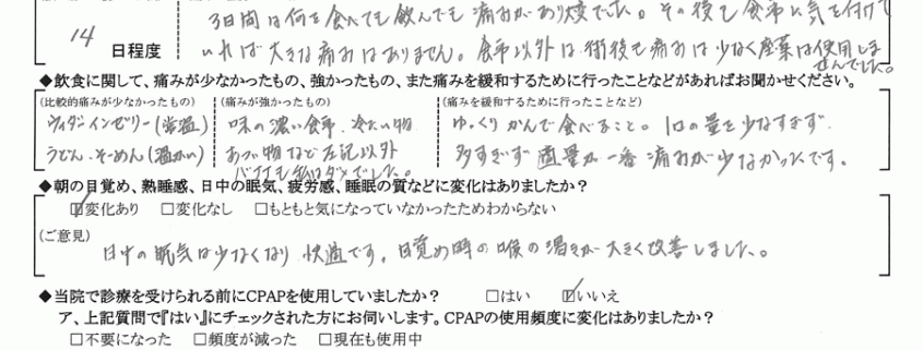日中の眠気は少なくなり快適です。目覚め時の喉の渇きが大きく改善しました。