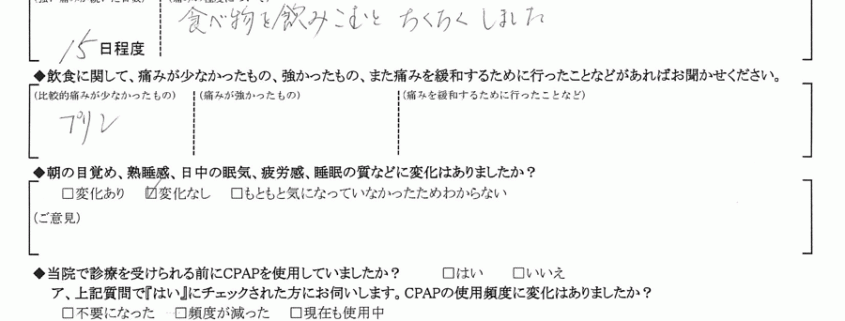 お陰様であれほど悩みの種でしたいびきが軽減し、嬉しい限りです。