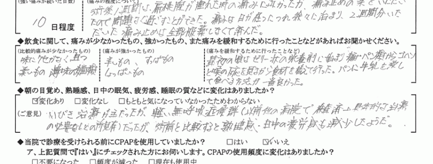 (ご意見) いびき治療が主だったが、軽い無呼吸症候群(以前他の病院で検査済→具体的な治療の必要なしとの所見有)だったが、術前と比較すると熟睡感・日中の疲労感も減少したようだ。