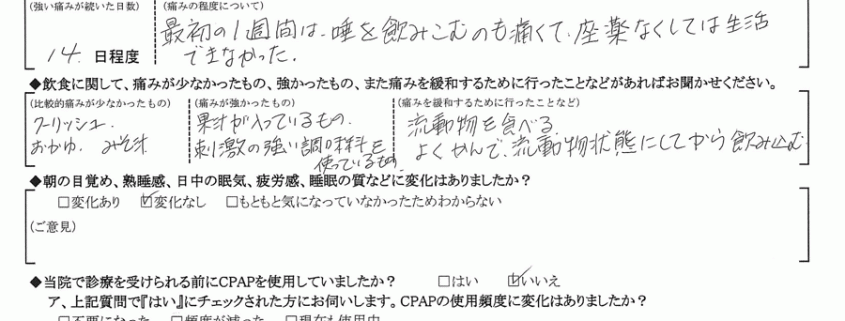 A:(痛みを緩和するために行ったこと) 流動物を食べる。よくかんで流動物状態にしてから飲み込む。