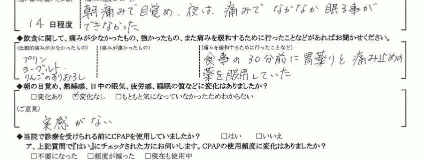 A:(痛みの程度について) 朝痛みで目覚め、夜は痛みでなかなか眠る事ができなかった。