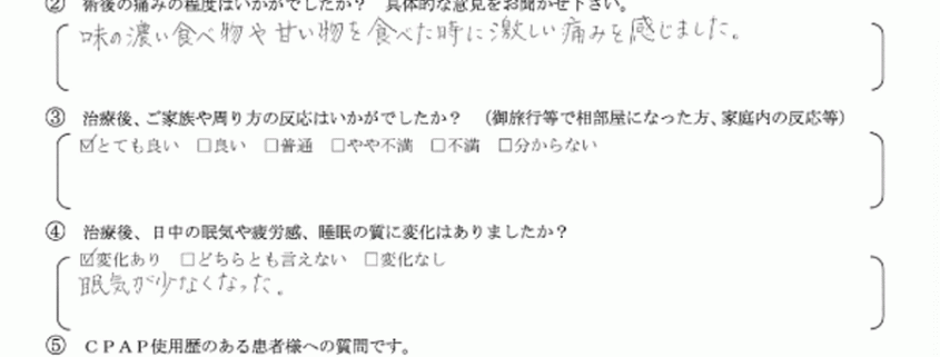 A:結婚して12年になりますが、私のいびきでずっと主人に迷惑をかけていて、何度もこれが原因でケンカをしましたが、術後は主人も大満足で前よりも優しくなり夫婦仲がもっと良くなりました。自分では気付きませんが、毎日の事なので家族はたまったもんではなかったのを、知らずに過ごしてきたのを今解り、手術を受けて本当に良かったと思います。