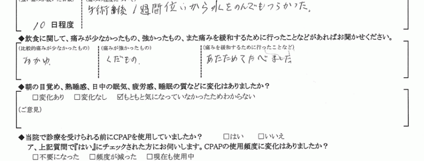 A:(痛みの程度について) 手術後1週間位から、水を飲んでもつらかった。