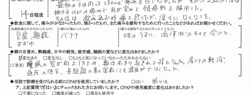 A:(痛みの程度について) かぜでのどが痛いときの激しい感じ。水も飲み込むのがつらい。食事も7日くらいは流動食のみ。さらに寝ている時がつらかった。痛くて何度も起きた。朝が一番つらかった。