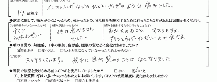 A:(痛みの程度について) インフルエンザなどのひどいかぜのような痛みでした。