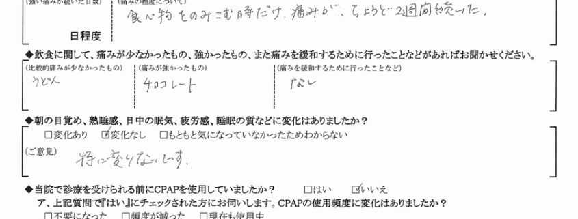 A:(痛みの程度について) 食べ物をのみこむ時だけ、痛みがちょうど2週間続いた。