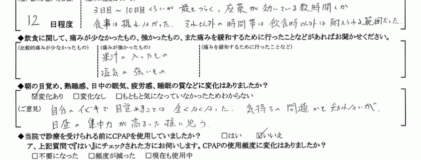 (ご意見) 自分のイビキで目覚める事は全くなくなった。気持ちの問題かもしれないが、日昼の集中力が高まった様に思う。