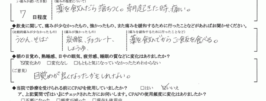 A:(痛みの程度について) 薬を飲んだら落ちつく。朝起きた時痛い。
