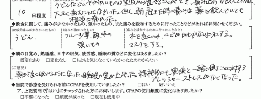 A:診療前は効果がどれだけあるか、手術はどれくらい痛いのか、術後どれくらい苦しいのか、不安な事が沢山あったが、いびきがなくなく事とトレードオフした時に、思い切って受けてみて良かったと思う。