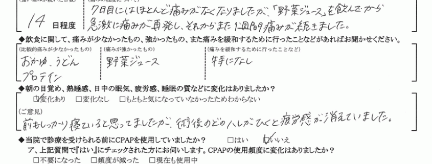 (ご意見) 前もしっかり寝ていると思ってましたが、術後のどのハレがひくと疲労感が消えていました。