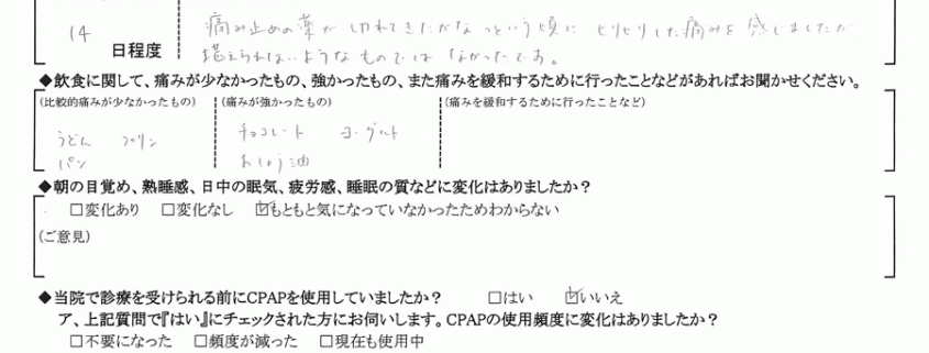 A:診療を受けてから終わるまで、あっという間でした。いびきゼロになったらもっとよかったですが、効果はあったと思います。思い切って手術を受けて良かったと思います。