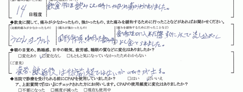 A:術後、本当に痛みが消えるのかと不安でしたが、2週間程で痛みも消え、肝心のいびきはほぼ消失しとても感謝しております。