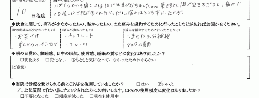 A:(痛みの程度について) つばを飲むのも痛く、2kgほど体重がおちました。薬を飲む間が空きすぎると、痛みで2口しかご飯が食べられなかったり…痛みはとても辛かったです!