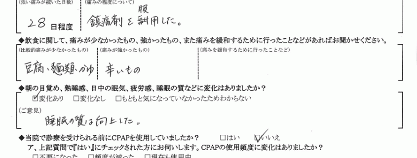 A:治療には満足しているものの、痛みが約2ヶ月残った。唾が気管に入ってしまう事が多くなった。