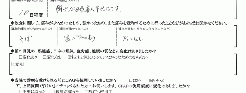 A:(痛みの程度について) 朝が10日位痛く辛かったです。