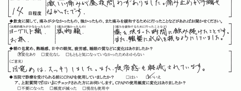 (ご意見) 自覚はできませんが、妻から「あっいびきかいてるな」というレベルにまで、音が小さくなったと聞きました。また、術前よりも長い距離を歩いても息切れしなくなりました。術前は「怪獣」くらいの音と評されていましたが、気にならない程度まで改善されたとの事です
