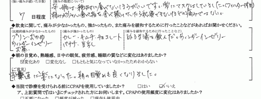 A:(痛みの程度について) 辛い物は絶対に食べない方がいいです。常にマスクはしていました。(フィルター付き)