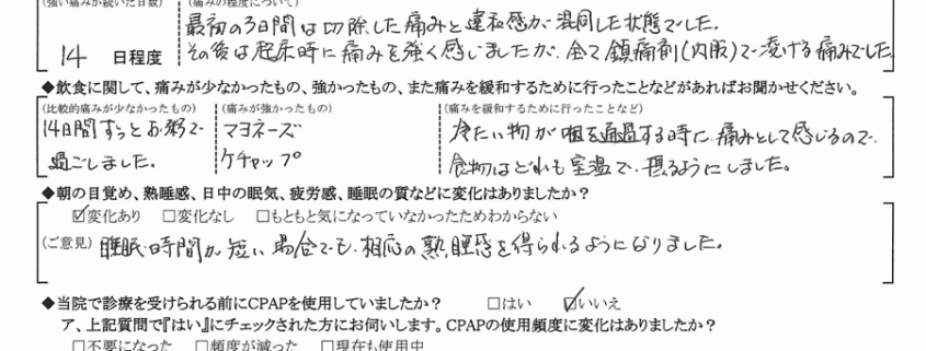 A:(痛みの程度について) 最初の3日間は切除した痛みと違和感が混同した状態でした。その後は起床時に痛みを強く感じましたが、全て鎮痛剤(内服)で凌げる痛みでした。