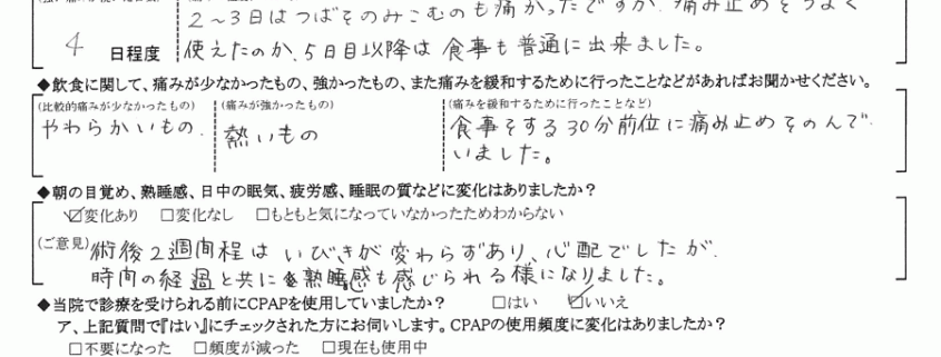 (ご意見) 術後2週間程はいびきが変わらずあり、心配でしたが、時間の経過と共に熟睡感も感じられる様になりました。