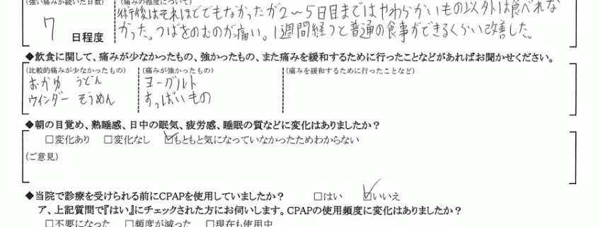 A:(痛みの程度について) 術後はそれほどでもなかったが、2~5日目まではやわらかいもの以外は食べれなかった。つばをのむのが痛い。一週間経つと普通の食事ができるくらい改善した。