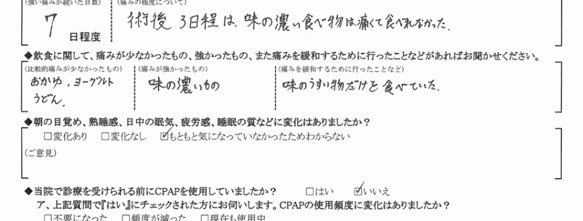 A:(痛みの程度について) 術後3日程は、味の濃い食べ物は痛くて食べれなかった。