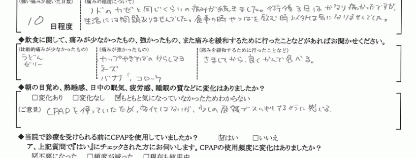 A:(痛みの程度について) ノドの風邪と同じくらいの痛みが続きました。術後3日はかなり痛かったですが、生活には問題ありませんでした。食事の時やつばを飲む時以外は気になりませんでした。