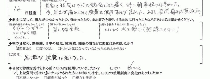 A:(痛みの程度について) 最初の3日間はツバを飲み込むのも痛く、特に朝寝起きは辛かった。今、思えば痛み止めの座薬を使用すれば良かった。ある日、突然痛みが無くなった。
