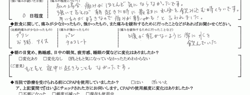 A:手術=痛いと思いがちですが、思っていたよりも全く痛みがなくて助かりました。ただ、何となく喉の違和感があり、気になるとずっと気になってしまいます。たぶん、この違和感もだんだんと無くなっていくのだろうと思います。それよりも周囲を気にすることもなく寝られることの喜びの方がずっと大きいです。