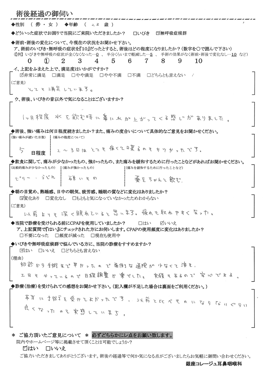 ア, 術前のいびき・無呼吸の症状を『10』だったとすると、術後はどの程度になりましたか? 【1】