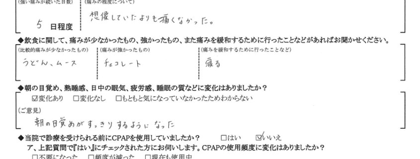 (痛みの程度について) 想像していたよりも痛くなかった。