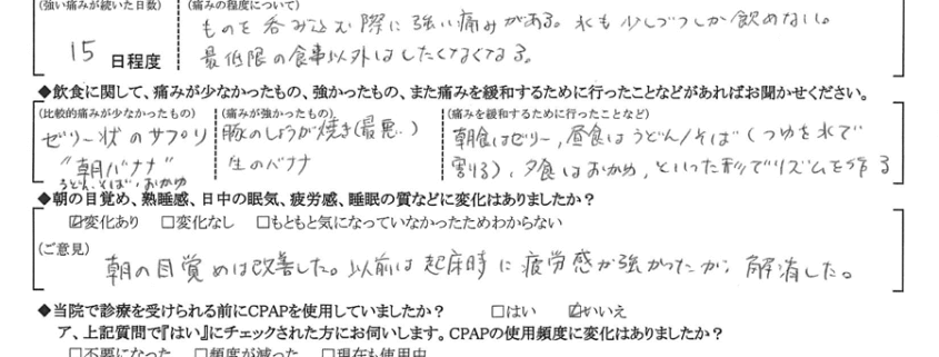 A:(痛みを緩和するために行ったこと) 朝食はゼリ―、昼食はうどん/そば(つゆを水で割る)、夕食はおかゆといった形でリズムを作る。