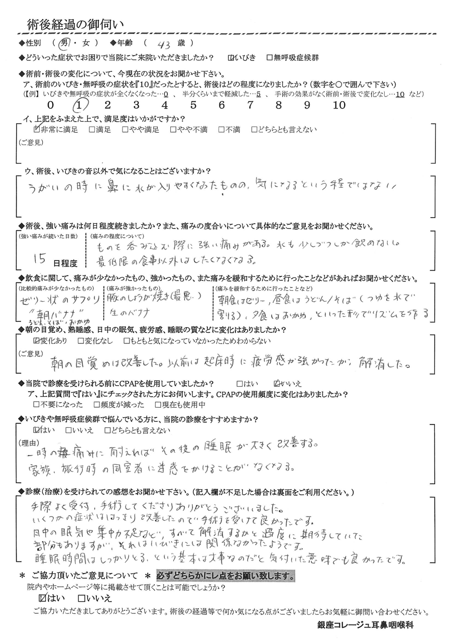 ア, 術前のいびき・無呼吸の症状を『10』だったとすると、術後はどの程度になりましたか? 【1】