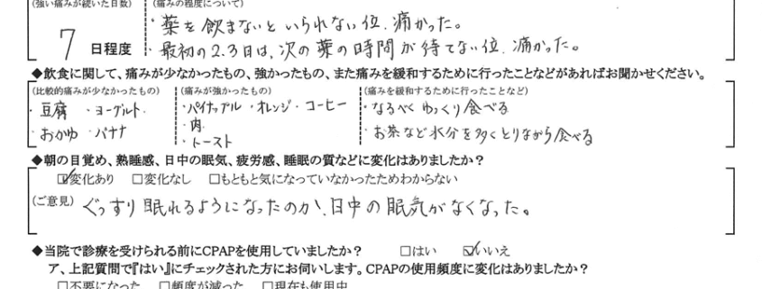 A:(痛みを緩和するために行ったこと) なるべくゆっくり食べる。お茶など水分を多くとりながら食べる。
