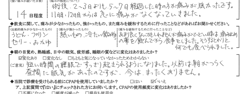 (ご意見) 同じ部屋で寝ている家族からは、以前のような轟音・騒音のようないびきは全くなくなったとの事です。